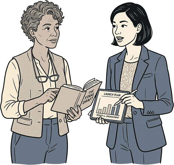It can include positioning, description and bio refinement, metadata strategy, review planning, website and platform readiness, launch planning, selective publicity, speaking or partnership strategy, and media coaching when appropriate.