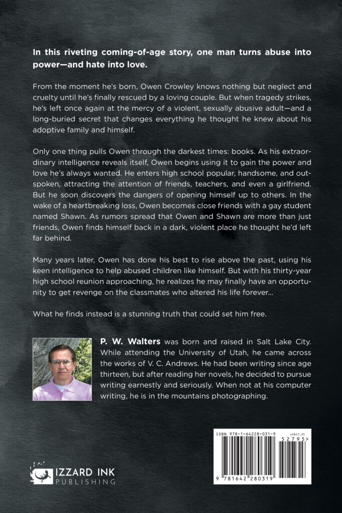 P. W. Walters was born and raised in Salt Lake City. While attending the University of Utah, he came across the works of V. C. Andrews. He had been writing since age thirteen, but after reading her novels, he decided to pursue writing earnestly and seriously. When not at his computer writing, he is in the mountains photographing.