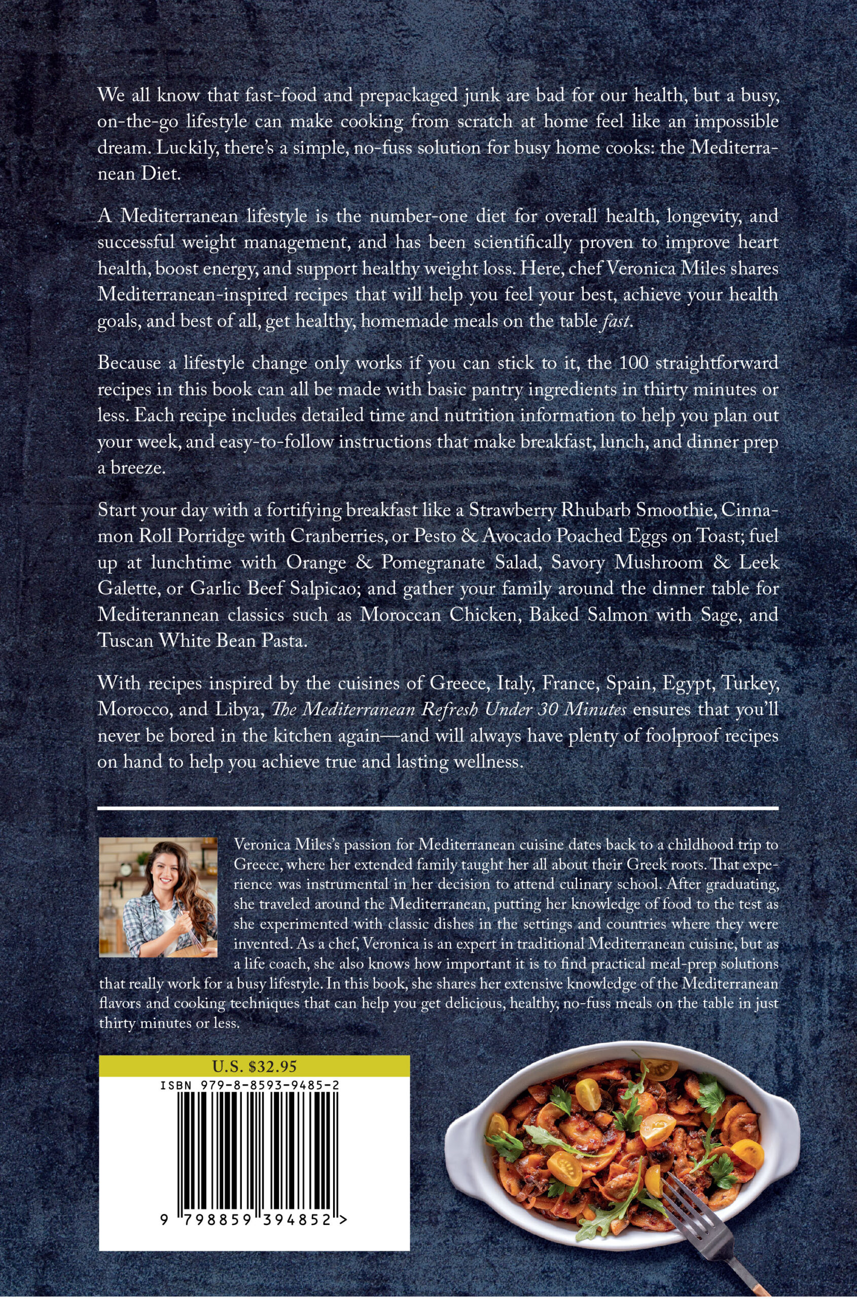 Chef Veronica Miles offers a delicious journey into the heart of Mediterranean cuisine. A childhood trip to Greece and her family’s Greek heritage both inform Veronica’s lifelong culinary journey. Armed with a solid foundation from culinary school and insights gained from extensive travel throughout the Mediterranean, she has perfected her craft in creating traditional meals. Veronica is not just a master chef; as a life coach, she understands the art of balancing busy life schedules with wholesome cooking. The Mediterranean Refresh Under 30 Minutes presents a beautiful fusion of her experiences in the Mediterranean, with the need for speedy, healthy meals for today’s bustling lifestyles.